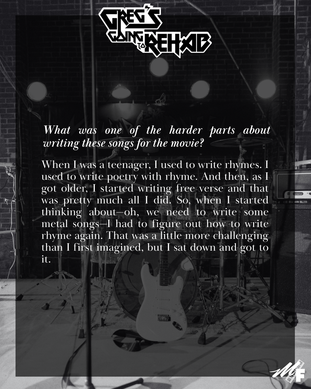 The songs I was writing had to feel like they could have been written in the haze of 1987. They had to feel authentically metal, the kind of tracks that could live inside the world of Greg’s Going to Rehab.
